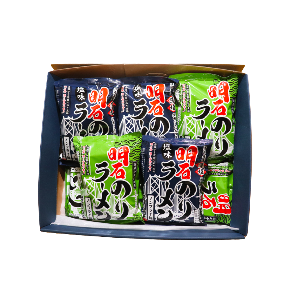 めん:小麦粉(国産)、海苔(兵庫県明石産)、小麦タンパク、食塩、焼成カルシウム、未焼成カルシウム 添付調味料:醤油、食塩、食用植物油、鰹節エキス、昆布エキス、椎茸エキス、魚醤、酵母エキス、小麦、グルテン酵素分解物、蛋白加水分解物、砂糖、香辛料、ねぎ、鰹節、いりこ(原材料の一部に小麦、大豆、魚介類を含む)
